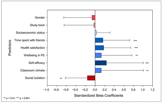 A stepwise multiple linear regression was conducted with mental wellbeing as the dependent variable. To ensure the validity of the results, we verified that the assumptions of normality, linearity, multicollinearity, and homoscedasticity were not violated. Gender, study track, and SES were entered at Step 1, explaining 6% of the variance in mental wellbeing. At Step 2, time spent with friends and health satisfaction were added, increasing the explained variance to 20%. Finally, at Step 3, the inclusion of the four school-related variables, wellbeing in PE, self-efficacy, classroom climate, and social isolation, enhanced the model, explaining 37% of the variance in mental wellbeing, F (9,436) = 29.5, p < 0.001. The beta coefficients were subsequently analyzed to assess the relative impact of each predictor, highlighting their significance to students’ mental wellbeing.