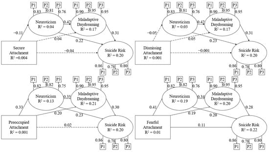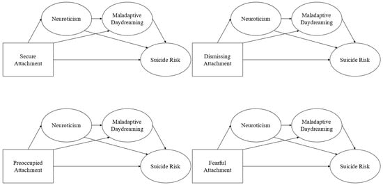 A Hybrid Structural Equation Modeling (SEM) approach was utilized to conduct the subsequent analyses. In this approach, attachment styles were treated as observable variables, while neuroticism, MD, and SR were treated as latent variables. Four distinct mediation models, one for each attachment style, were examined. These models included attachment styles as predictors, neuroticism as the initial mediator, MD as the subsequent mediator, and SR as the outcome variable (Figure 1). Indirect effects were evaluated using the bootstrap method with 5000 resamples.