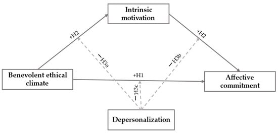 In this sense, the impact of the ethical climate on intrinsic motivation and affective commitment has not been sufficiently analyzed (Borhani et al., 2014; Demirtas & Akdogan, 2015; Hefny, 2021; Huang et al., 2012; Santiago-Torner et al., 2025b). Therefore, the first objective of this study was to assess the relationship between ethical climate and affective commitment, taking into account the mediating effect of intrinsic motivation. To be more specific, we will focus on a particular ethical climate, which is benevolent, as several studies have highlighted its integrative character, making decisions based on the interest and protection of the entire community (Derin et al., 2022). Indeed, benevolence seeks options that maximize joint interests, even if this involves reducing the satisfaction of individual needs (Cullen et al., 2003). In a broader sense, a benevolent ethical climate not only seeks the well-being of all employees within organizations but also cares about social interests in general. In reality, a benevolent ethical climate focuses more on results and the impact that organizational behavior has than on simple intentions that in the end do not have a significant repercussion on society (Blome & Paulraj, 2013).