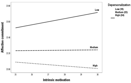 In second place, the relationship between intrinsic motivation and affective commitment was moderated by depersonalization (b = −0.02, SE = 0.01, 95% CI = [−0.09, −0.54]) (Table 3, Figure 2). In addition, Figure 4 explains the detail of the moderation. At medium and high levels of depersonalization, the association between intrinsic motivation and affective commitment is interrupted. Only low depersonalization allows intrinsic motivation to influence affective commitment. The medium and high effects of depersonalization are not significant. Therefore, H3b is accepted.