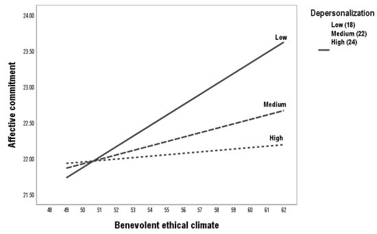 Depersonalization moderates the positive relationship between a benevolent ethical climate and affective commitment, so that when depersonalization is high, the positive relationship between a benevolent ethical climate and affective commitment stops.
