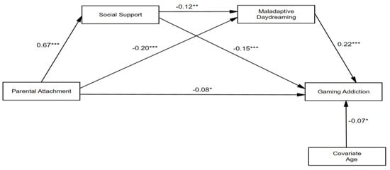 The results of the correlations and descriptive statistics are shown in Table 1. There was a negative correlation between age, gaming addiction, and parental attachment, suggesting that older adolescents tend to have fewer problems with gaming (r = −0.07, p < 0.05), and less parental attachment (r = −0.13, p < 0.001). Of the main variables examined in the model, gaming addiction, social support, maladaptive daydreaming, and parental attachment were significantly correlated with each other. Specifically, gaming addiction was negatively correlated with social support (r = −0.26, p < 0.001) and parental attachment (r = −0.24, p < 0.001), and positively associated with maladaptive daydreaming (r = 0.29, p < 0.001). Social support was negatively correlated with maladaptive daydreaming (r = −0.26, p < 0.001) and positively associated with parental attachment (r = 0.66, p < 0.001). Maladaptive daydreaming was negatively associated with parental attachment (r = −0.28, p < 0.001).