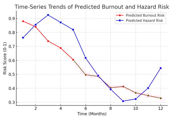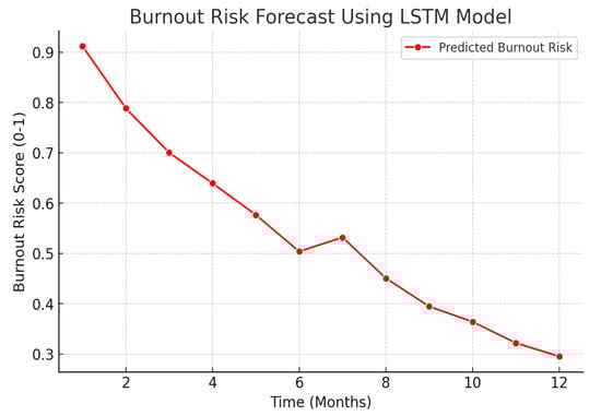 Figure 2 presents the burnout risk forecast generated by the LSTM model, showing predicted risk levels over time based on temporal patterns in occupational stress data.