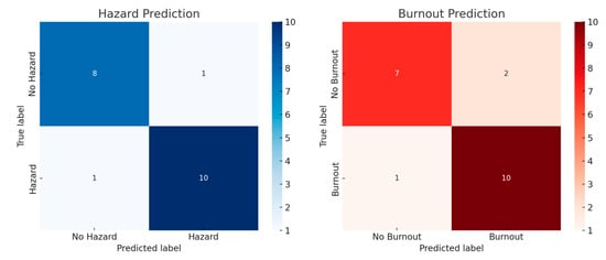 Confusion matrix analysis showed that XGBoost and LSTM maintained high precision and recall, minimizing false positives in hazard and burnout prediction.