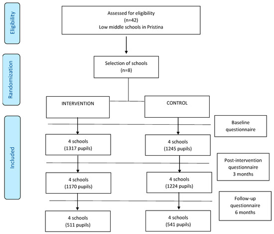 The study involved children from low–middle schools in Pristina, Kosovo, specifically from 5th to 9th grades. Eight schools were selected, with four schools randomly assigned to the intervention group and four to the control group (Figure 1: Flow Diagram).