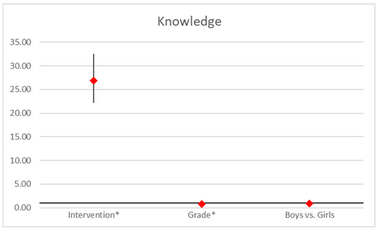 The knowledge score was significantly influenced by the intervention and grade. The intervention had a strong positive effect (OR = 26.83, 95% CI [22.12, 32.54], p < 0.001), substantially improving knowledge scores post-intervention. In contrast, higher grades were associated with lower knowledge scores (OR = 0.78, 95% CI [0.73, 0.82], p < 0.001), indicating that as grade levels increased, knowledge scores tended to decrease slightly. Gender showed no significant impact on knowledge (OR = 0.91, 95% CI [0.78, 1.05], p = 0.075; Figure 2).