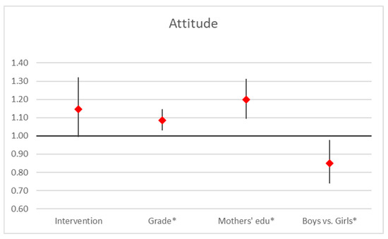 Our analysis reveals that the attitude score is significantly influenced by grade, mother’s education, and gender. Mother’s education had the strongest positive impact (OR = 1.20, 95% CI [1.09, 1.31], p < 0.001), indicating that higher maternal education levels are associated with improved scores. Grade level also showed a positive effect (OR = 1.09, 95% CI [1.03, 1.15], p = 0.003), suggesting a slight increase in scores with advancing grade. Gender had a significant effect (OR = 0.85, 95% CI [0.74, 0.98], p = 0.023), highlighting disparities between genders, with boys scoring significantly lower than girls. The intervention had a positive but marginal effect (OR = 1.15, 95% CI [0.99, 1.32], p = 0.059; Figure 3).