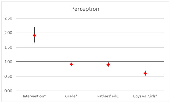 Our analysis indicates that the perception score is significantly influenced by the intervention, grade, and gender. The intervention had a strong positive effect (OR = 1.92, 95% CI [1.66, 2.21], p < 0.001), greatly improving perception scores. In contrast, higher grades were associated with a slight decrease (OR = 0.92, 95% CI [0.87, 0.97], p = 0.002), and gender showed a notable effect (OR = 0.60, 95% CI [0.52, 0.70], p < 0.001), revealing disparities between genders, with girls scoring higher than boys. Father’s education had a marginal impact (OR = 0.91, 95% CI [0.82, 1.00], p = 0.052; Figure 4).