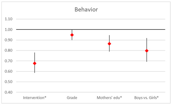 Regression analysis on behavior scores. Point estimates and 95% confidence interval in odds ratios of ordered logistic regression analysis (*… p < 0.05).