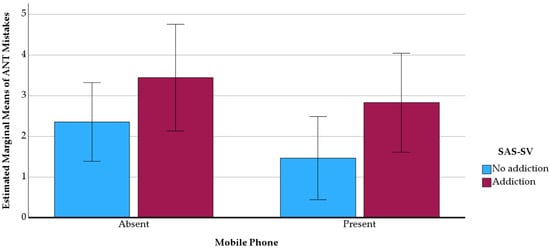 A two-way between-groups ANOVA was conducted to investigate the effects of self-reported mobile phone addiction and mobile phone presence on attentional performance, measured by errors and completion time in the ANT. Participants were classified into two groups based on their SAS-SV scores: no addiction (score ≤ 32, n = 87) and addiction (score ≥ 33, n = 54). The analysis revealed a significant main effect of addiction level on errors [F(1, 137) = 4.548, p = 0.035, η2p = 0.032], indicating that individuals with higher levels of addiction made more mistakes. However, no significant interaction was found between mobile phone addiction and phone presence (see Figure 2). For completion time, neither the main effects nor the interaction reached statistical significance. Thus, the hypothesis (H4) that higher levels of SAS-SV would be associated with poorer attentional performance on tasks requiring sustained concentration and cognitive flexibility was only partially supported, as depicted in Figure 2.