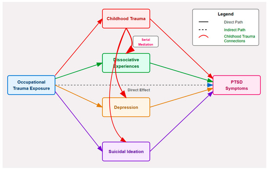 Path diagram illustrating the hypothesized multiple mediation model showing relationships between occupational trauma exposure, mediators (childhood trauma, dissociative experiences, depression, and suicidal ideation), and PTSD.