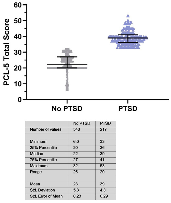 The LEC-5 analysis indicated that participants with PTSD vs. without PTSD may have encountered a greater frequency of distressing life events (62.2% vs. 37.4%; p < 0.05). According to the PCL-5 data, after the grouping of study participants without or with PTSD determined with a PCL-5 score of 33 and above, the no PTSD group had 543 (71.5%) participants with a median (25–75% IQR) PCL-5 score of 22 (20–27), and the PTSD group had 217 (28.5%) participants with a median (25–75% IQR) PCL-5 score of 39 (33–41) (Figure 2).