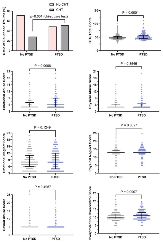 The proportion of childhood trauma in the participants with PTSD was higher than that in the participants without PTSD (51.2% vs. 28.4%; p < 0.05) (Figure 3). The total score of CTQ-33 in the participants with PTSD was higher than that in the participants without PTSD [51 (IQR: 45–57) vs. 48 (IQR: 45–57); p < 0.05]. The emotional abuse, physical neglect, and overprotection scores in the participants with PTSD were found to be higher than those in the participants without PTSD (p < 0.05). On the other hand, the physical abuse, emotional neglect, and sexual abuse scores in participants with and without PTSD were found comparable (p > 0.05).