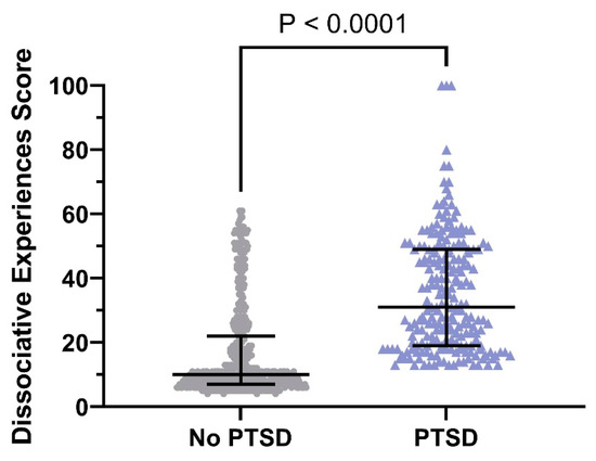 The analysis of DES data revealed that there were 56 (10%) participants with positive dissociative experiences in the no-PTSD group, there were 113 (52%) participants with positive dissociative experiences in the PTSD group, and their ratios were significantly different (p < 0.05) (Figure 4). It is also worth noting that the total score of DES in the participants with PTSD was significantly higher than that in the participants without PTSD [31 (IQR: 19–49) vs. 10 (IQR: 7–22); p < 0.05].