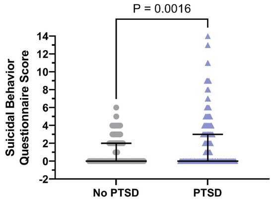 After analyzing the SBQ-4 data, it appears that 338 (62.2%) participants in the no PTSD group exhibited negative suicidality, while 119 (54.8%) participants in the PTSD group demonstrated positive suicidal thoughts (Figure 5). It is noteworthy that the ratios between these two groups were significantly different (p < 0.05). It appears that the total score of SBQ-4 in the participants with PTSD was significantly higher than that in the participants without PTSD [0 (IQR: 0–3) vs. 0 (IQR: 0–2); p < 0.05].