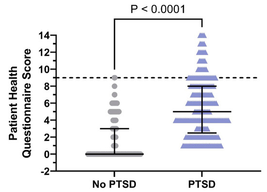 The PHQ-9 data analysis revealed that 356 (65.6%) participants in the no-PTSD group did not have depression, while 217 (100%) participants in the PTSD group had at least mild depression (Figure 6). The ratios between these groups were significantly different (p < 0.05). The total score of PHQ-9 in the participants with PTSD was significantly higher than that in the participants without PTSD [5 (IQR: 2.5–8) vs. 0 (IQR: 0–3); p < 0.05]. It is noteworthy that participants without PTSD did not exhibit any depression at a moderate to severe level.