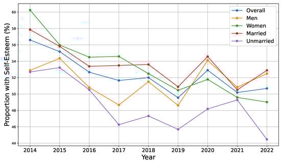 Figure 1 presents trends in self-esteem data from 2014 to 2022, including overall patterns and breakdowns by gender and marital status. The overall self-esteem level declined gradually from 2014 to 2019, rose slightly in 2020, and then fell sharply beginning in 2021. As the effects of the COVID-19 pandemic are reflected in the data from 2021 onward, the recent decline likely captures its psychological and social consequences. Married individuals consistently exhibited higher levels of self-esteem than unmarried individuals throughout the observation period, suggesting a stable association between marital status and psychological well-being. By contrast, a notable shift was observed in gender-based patterns. Namely, women reported higher self-esteem than men from 2014 to 2019, whereas this trend reversed in 2020, with men exhibiting higher levels for the remainder of the survey period. This reversal might reflect gendered differences in the effects of the pandemic and related social disruptions on individuals. Given the differences between men and women across various socioeconomic dimensions, such as employment patterns, caregiving responsibilities, and exposure to economic stressors, direct comparisons of self-esteem levels can be misleading without appropriate statistical controls. Our analysis highlighted the importance of adjusting for these covariates to better understand the independent relationships of gender and other factors with self-esteem in the Japanese context.