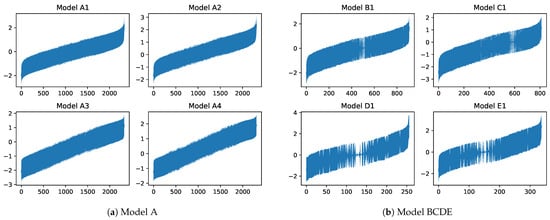 The above findings were from Model A1. Notably, Table 4 shows no clear differences among the results of all models. Therefore, despite Model A1 being the best model, the effects of explanatory variables on self-esteem were similar across other models, indicating robust results. Considering Figure 2a, which shows individual effects in ascending order, the central line and bands represent the posterior mean and posterior standard deviation (±1 standard deviation), respectively. The results were consistent across all models, with the difference between the largest and smallest effects being approximately 4. The effect of having a spouse () and the effect of gender () showed that individual characteristics had a substantial impact on self-esteem. This reinforces the importance of controlling for individual effects in social and economic analyses.