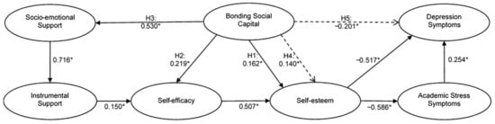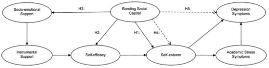 Social capital, specifically, bonding social capital (BSC), influences depression symptoms (Dsym) through its indirect effects on academic stress, specifically, its symptoms, and on sEstee. That is, BSC, through socio-emotional support (SES) and instrumental support (IS), provides social (i.e., external) resources that allow for developing or strengthening psychological resources (i.e., internal, specifically, self-efficacy (sEffic) and sEstee). And sEstee influences Dsym, either directly or through its influence on academic stress symptoms (ASsym) (Thoits, 1985, 2011).