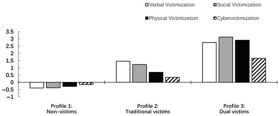 The z-scores of the indicators in each profile are illustrated in Figure 1 to better depict the characteristics of each group. As shown, Profile 1 (n = 989, 82.1%) represents the largest group, comprising students with all victimization z-scores below the average level. This profile was labeled as “non-victims”. Profile 2 (n = 156, 13.0%) was the second-largest group, where all indicators were positive, and the level of cybervictimization in this profile was relatively lower than the three forms of traditional victimization. This profile was labeled as “traditional victims”. Profile 3 (n = 59, 4.9%), as the smallest group, included students with the highest levels across all victimization types, including verbal, social, physical, and cybervictimization, relative to the other profiles, earning the label “dual victims”.