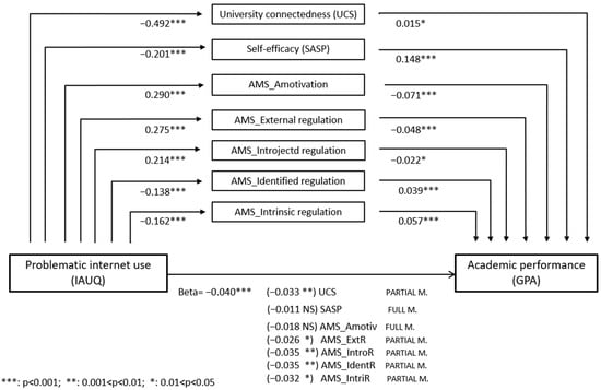 Univariable linear models were applied to assess the direct effect (Step 1 of the mediation model) of alcohol/substance risky use and problematic internet use on academic performance (GPA). Only problematic internet use was significantly associated with GPA, with a beta regression coefficient equal to −0.040 (p < 0.001). Additionally, the association of problematic internet use with the seven potential mediators (i.e., academic engagement variables) was examined using seven separate regression models (Step 2 of the mediation model). Significant negative correlations were found for UCS, SASP, and Identified regulation and Intrinsic regulation AMS subscales (p < 0.001 for all). Significant positive correlations were found for Amotivation, External regulation and Introjected regulation AMS subscales (p < 0.001 for all). Multivariable regression models (Step 3 of the mediation model) identified SASP and the Amotivation AMS subscale as full mediators of the relationship between problematic internet use and GPA, as the direct effect was no longer significant after adjusting for these mediators. The remaining five academic engagement variables acted as mediators, as the direct effect remained significant but was reduced in magnitude (Figure 1).