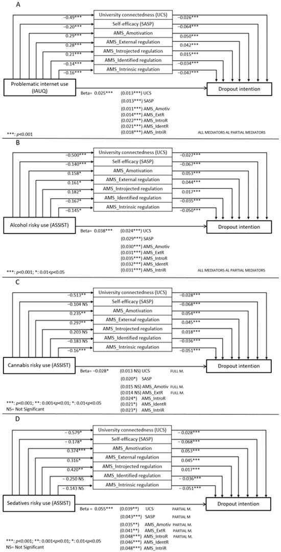 Regarding the second outcome (dropout intentions), it was positively correlated (p < 0.001) with both problematic internet use and risky substance use, although Spearman’s rho coefficients were relatively low for alcohol, cannabis, and sedatives. Moreover, risky substance use was correlated with UCS, SASP and all five AMS subscales, which were, in turn, correlated with dropout intentions (see correlation matrix in Supplementary Materials, Table S2). These correlation analyses further suggest that academic engagement variables may mediate the relationship between substance/internet risky use and dropout intentions.