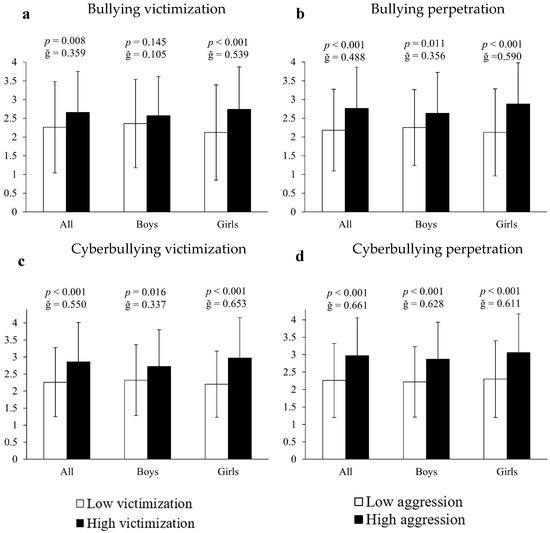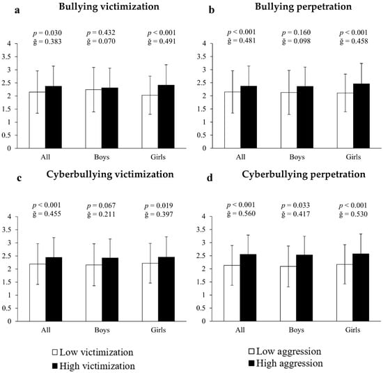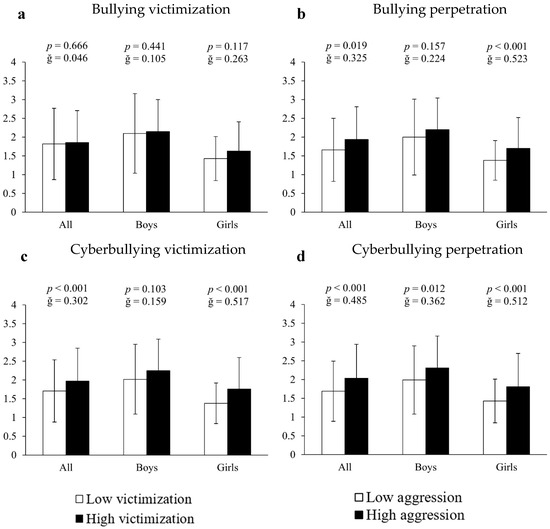 Analysis of covariance employing inappropriate internet use as the dependent variable and bullying measures as the fixed factor showed that, in all cases, victims and perpetrators of bullying, as well as victims and perpetrators of cyberbullying, presented significantly higher scores (10.23%, 13.68%, 11.42% and 19.72%, respectively) of internet abuse compared to all other participants (all F[1,661] > 11.213, p < 0.030, ğ > 0.383, Figure 1a–d). When the results were differentiated by sex it was found that, in all cases, girls immersed in bullying situations had significantly higher scores of inappropriate internet use: (A) for bullying victims = 18.72% (2.41 ± 0.78 vs. 2.03 ± 0.73 a.u., F[1,351] = 13.351, p < 0.001, ğ = 0.491, 1 − β = 0.954, Figure 1a); (B) for bullying perpetrators = 16.59% (2.46 ± 0.78 vs. 2.11 ± 0.72 a.u., F[1,351] =16.242, p < 0.001, ğ = 0.458, 1 − β = 0.980, Figure 1b); (C) for cyberbullying victims = 10.36% (2.45 ± 0.78 vs. 2.22 ± 0.76 a.u., F[1,351] = 14.609, p < 0.019, ğ = 0.397, 1 − β = 0.927, Figure 1c) and (D) for cyberbullying perpetrators = 18.43% (2.57 ± 0.76 vs. 2.17 ± 0.75 a.u., F[1,351] = 27.807, p < 0.001, ğ = 0.530, 1 − β = 0.999, Figure 1d). For boys, the results showed 21.05% more inappropriate internet use in cyberbullying perpetrators (2.53 ± 0.71 vs. 2.09 ± 0.78 a.u., F[1,304] = 21.894, p = 0.033, ğ = 0.5876, 1 − β = 0.967). No significant differences were found in either victims or victims/offenders of bullying (all p > 0.05).