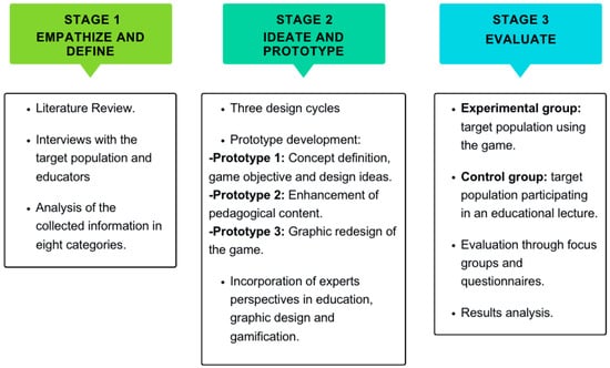 We conducted applied and experimental research. The design, development, and evaluation of Nutriacción+ were guided by the Design Thinking methodology. This process focused on understanding the characteristics and specific needs of children and adolescents living in conditions of economic and educational vulnerability.