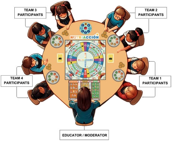 Nutriacción+ is aimed at children and adolescents. The game requires one adult to serve as a game moderator. Figure 2 shows a session of the Nutriacción+ game.