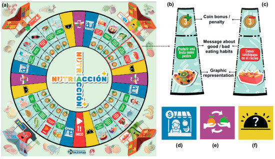 Main board and spaces of Nutriacción+. (a) Main board game; (b) bonus space; (c) penalty space; (d) market space; (e) trade advantage space; and (f) surprise space.
