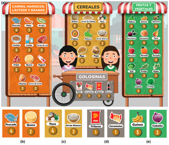 Marketplace board detail. (a) Marketplace board; (b) protein group; (c) carbohydrate group; (d) sweets group; and (e) fruit and vegetable group.