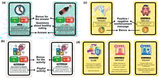 Surprise cards. (a) Cards with questions about healthy eating; (b) cards with playful activities; (c) cards with positive or negative messages; and (d) cards that offer strategic advantages or disadvantages.