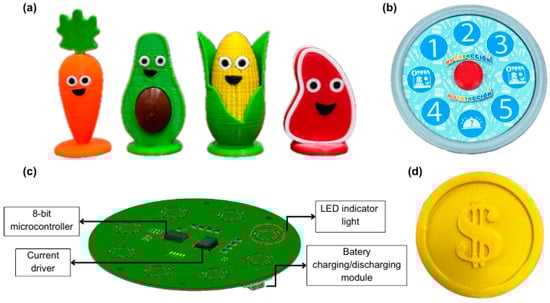 The main game board was printed on a 55 cm × 55 cm sheet of adhesive paper and then mounted on a paperboard base. The back of the board was reinforced with a vinyl sheet. The player pieces were made using 3D printing with low-cost PLA filament (Figure 8a). The coins are the element of exchange (money) in the game (Figure 8d), made in a 2.50 cm diameter and 3D printed.