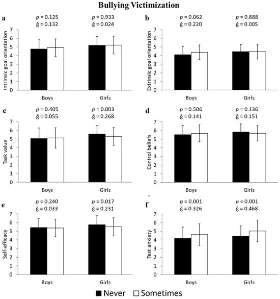 Differences in the subscales of motivational beliefs toward learning—(a) intrinsic goal orientation, (b) extrinsic goal orientation, (c) task value, (d) control beliefs, (e) self-efficacy, and (f) test anxiety—between students who have never been victims and those who have experienced bullying victimization, differentiated by boys and girls.