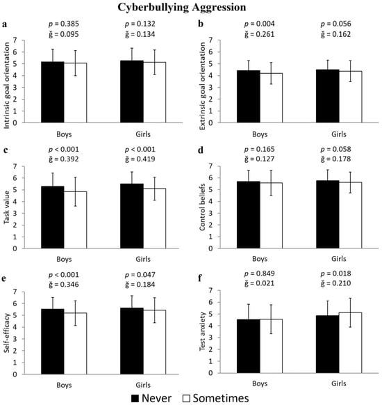 Differences in the subscales of motivational beliefs toward learning—(a) intrinsic goal orientation, (b) extrinsic goal orientation, (c) task value, (d) control beliefs, (e) self-efficacy, and (f) test anxiety—between students who have never engaged in cyberbullying aggression and those who have, differentiated by boys and girls.