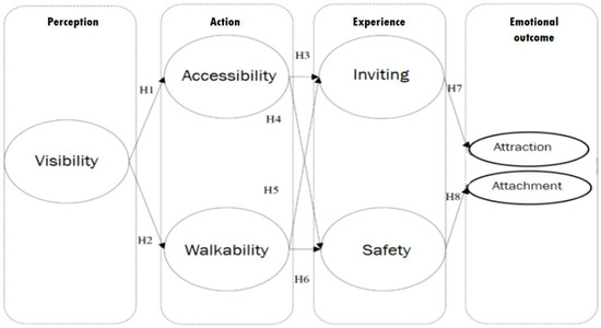 The results of the indirect effect analysis showed that visibility has an indirect positive effect on safety, Invitingness, attraction, and attachment; walkability also has indirect positive effects on attachment and attraction. Accessibility also has indirect positive effects on attachment and attraction as demonstrated in Table 6.