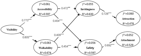 The model verification results show the following: Hypothesis 1 was supported, as visibility has a positive effect on accessibility (β = 0.773 ***). Hypothesis 2 was supported, as visibility has a positive effect on walkability (β = 0.805 ***). Hypothesis 3 was supported, as accessibility has a positive effect on Invitingness (β = 0.472 **). Hypothesis 4 was supported, as walkability has a positive effect on Invitingness (β = 0.409 ***). Hypothesis 5 was supported, as accessibility positively affects safety (β = 0.404 ***). Hypothesis 6 was supported, as walkability has a positive effect on safety (β = 0.454 ***). Hypothesis 7 was supported: Invitingness positively affects attraction (β = 0.728 ***). Hypothesis 8 was supported, as safety has a positive effect on attachment. (β = 0.692 ***).