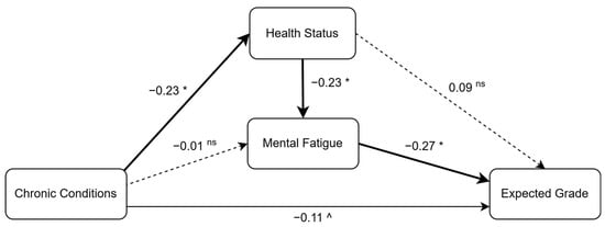 In the path analysis, the factors examined included expected grade, mental fatigue, and health status as endogenous variables, while chronic conditions were an exogenous variable. In addition, mental fatigue and health status served as mediator variables in the model. The size and direction of effects were determined from standardized path coefficients (betas) obtained using Mplus Version 8.11 (Muthén & Muthén, 2017). Indirect effects were estimated, and their statistical significance was assessed by calculating standard errors and p-values using the delta method (MacKinnon, 2008), as implemented in Mplus. Statistical significance for all direct and indirect effects was evaluated using p-values, with effects considered significant at alpha levels of 0.05 and 0.01. The specified path model was saturated, and consequently demonstrated an excellent fit to the data: CFI = 1.00; TLI = 1.00; RMSEA = 0.00; and SRMR = 0.00 (Kline, 2016). Furthermore, the AIC and BIC values were 3111.65 and 3160.08, respectively.