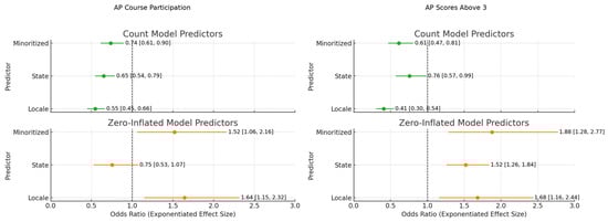 Figure 1 showcases the exponentiated coefficients (rate ratios and odds ratios) from Table 2 and Table 3, where ZINB assessed AP participation and AP scores above three. To the left of the vertical line, estimates less than one shows a reduced likelihood of AP participation and success based on each predictor (locale, state, majority-minoritized). Error bars represent 95% confidence intervals, and model components are color-coded for clarity.