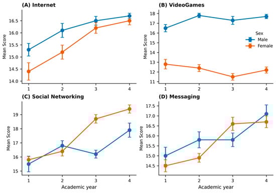 Mean self-reported usage scores across academic years for (A) Internet, (B) Video Games, (C) Social Networking, and (D) Messaging, stratified by sex. Error bars represent standard errors of the mean (±SEM). Male participants are represented in blue and female participants in orange. A progressive increase in usage across academic years is observed for most domains, with notable sex differences particularly in Video Games and Social Networking.