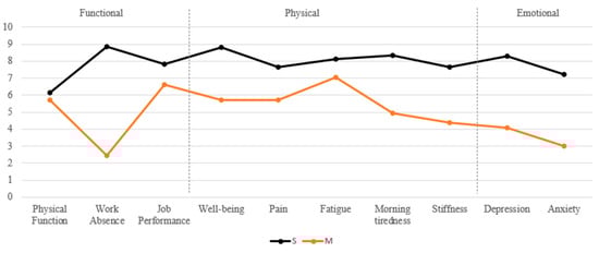 Descriptive and cluster analysis. Patients (N = 70) were analyzed across the three impact domains—Func, Phys, and Emot—and further subdivided into mild (M) and severe (S) impairment levels: Func-M (n = 49, 70.0%) vs. Func-S (n = 21, 30.0%), Phys-M (n = 18, 25.7%) vs. Phys-S (n = 52, 74.3%), and Emot-M (n = 28, 40.0%) vs. Emot-S (n = 42, 60.0%). Descriptive analysis of each FIQ impact domain across M and S clusters can be seen in Figure 1.