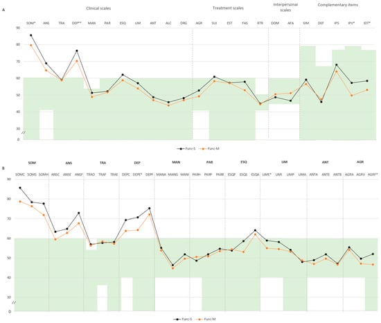 Comparison of PAI scale and subscale T-scores between mild and severe clusters for the functional impairment domain. Note. (A) Comparison between clusters in PAI scales and complementary items; (B) comparison between clusters in PAI subscales. The green zone indicates the ranges of normality, according to the psychometric criteria of the PAI. SOM: Somatic Complaints; ANS: Anxiety; TRA: Disorders Related to Anxiety; DEP: Depression; MAN: Mania; PAR: Paranoia; ESQ: Schizophrenia; LIM: Limit Traits; ANT: Antisocial Traits; ALC: Problems with alcohol; DRG: Problems with drugs; AGR: Aggression: SUI: Suicidal Ideation; EST: Stress; FAS: Lack of social support; RTR: Refusal to treatment; DOM: Dominance; AFA: Affability; SIM: Simulation Index; DEF: Defensiveness Index; IPS: Potential Suicide Index; IPV: Potential index of violence; IDT: Treatment Difficulty Index; Func-S: Fibromyalgia functional severe cluster; Func-M: Fibromyalgia functional mild cluster; (B) SOM-C: Conversion; SOM-S: Somatization; SOM-H: Hypochondria; ANS-C: Cognitive; ANS-E: Emotional; ANS-F: Physiological; TRA-O: Obsessive–compulsive; TRA-F: Phobias; TRA-E: Posttraumatic Stress; DEP-C: Cognitive; DEP-E: Emotional; DEP-F: Physiological; MAN-A: Activity level; MAN-G: Grandeur; MAN-I: Irritability; PAR-H: Hypervigilance; PAR-P: Persecution; PAR-R: Resentment; ESQ-P: Experiences. Psychotics; ESQ-S: Social Indifference; ESQ-A: Alteration of the Thought; LIM-E: Emotional instability; LIMI: Alteration of identity; LIM-P: Problematic Interpersonal Relationships; LIM-A: Self-aggression; ANT-A: Antisocial Behaviors; ANT-E: Egocentrism; ANT-B: Search for sensations; AGR-A: Attitude aggressive; AGR-V: Verbal aggression; AGR-F: Physical assaults; tatistically significant differences between groups: * p < 0.05; ** p < 0.01.