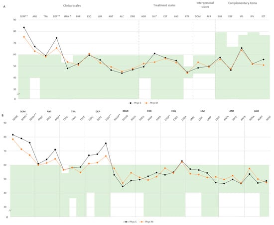 Comparison of PAI scale and subscale T-scores between mild and severe clusters for the physical impairment domain. Note: (A) Comparison between clusters in PAI scales and complementary items; (B) comparison between clusters in PAI subscales. The green zone indicates the ranges of normality, according to the psychometric criteria of the PAI. SOM: Somatic Complaints; ANS: Anxiety; TRA: Disorders Related to Anxiety; DEP: Depression; MAN: Mania; PAR: Paranoia; ESQ: Schizophrenia; LIM: Limit Traits; ANT: Antisocial Traits; ALC: Problems with alcohol; DRG: Problems with drugs; AGR: Aggression: SUI: Suicidal Ideation; EST: Stress; FAS: Lack of social support; RTR: Refusal to treatment; DOM: Dominance; AFA: Affability; SIM: Simulation Index; DEF: Defensiveness Index; IPS: Potential Suicide Index; IPV: Potential index of violence; IDT: Treatment Difficulty Index; Phys-S: Fibromyalgia physical severe cluster; Phys-M: Fibromyalgia physical mild cluster; (B). Note: SOM-C: Conversion; SOM-S: Somatization; SOM-H: Hypochondria; ANS-C: Cognitive; ANS-E: Emotional; ANS-F: Physiological; TRA-O: Obsessive–compulsive; TRA-F: Phobias; TRA-E: Posttraumatic Stress; DEP-C: Cognitive; DEP-E: Emotional; DEP-F: Physiological; MAN-A: Activity level; MAN-G: Grandeur; MAN-I: Irritability; PAR-H: Hypervigilance; PAR-P: Persecution; PAR-R: Resentment; ESQ-P: Experiences. Psychotics; ESQ-S: Social Indifference; ESQ-A: Alteration of the Thought; LIM-E: Emotional instability; LIMI: Alteration of identity; LIM-P: Problematic Interpersonal Relationships; LIM-A: Self-aggression; ANT-A: Antisocial Behaviors; ANT-E: Egocentrism; ANT-B: Search for sensations; AGR-A: Attitude aggressive; AGR-V: Verbal aggression; AGR-F: Physical assaults; statistically significant differences between groups: * p < 0.05; ** p < 0.01.