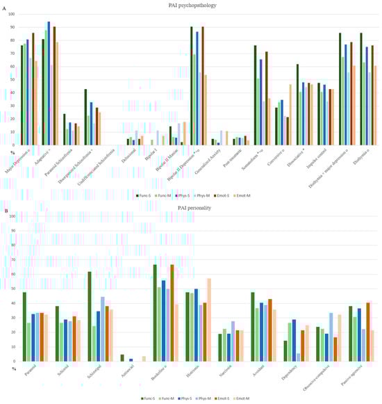 Comparison of PAI scale and subscale T-scores between mild and severe clusters for the functional, physical and emotional impairment domain. Note. (A) PAI psychopathology profiles; (B) PAI personality profiles. Func: Functional subgroup, Phys: Physical subgroup, Emot: Emotional subgroup, S: severe cluster, and M: mild cluster. Pairwise statistical significances at p < 0.05: *: Func-S vs. Func-M, +: Phys-S vs. Phys-M, and ο: Emot-S vs. Emot-M.