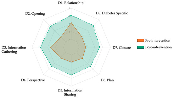 | 8.1 | Explains lab results (HbA1c) | 1.85 ± 0.70 | 3.93 ± 0.88 | 2.08 | 1.78–2.38 | 2.61 | 0.001 |