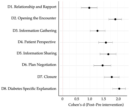 | Item | Domain/Skill (Abridged) | Pre-Intervention Mean ± SD | Post-Intervention Mean ± SD | Δ Mean | 95% CI (Δ) | Cohen’s d | p |