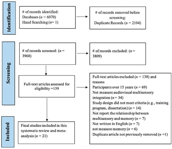 APA StyleAlhamdan, A. A., Pickering, H. E., Murphy, M. J., & Crewther, S. G. (2025). From Senses to Memory During Childhood: A Systematic Review and Bayesian Meta-Analysis Exploring Multisensory Processing and Working Memory Development. European Journal of Investigation in Health, Psychology and Education, 15(8), 157. https://doi.org/10.3390/ejihpe15080157
