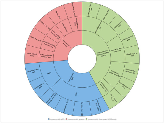 | 10 | (Cleary et al., 2001) | Motor non-timed Task (Auditory-plus-visual–spatial memory game) | Participants aged 8–9 years were instructed to press appropriate buttons on the response box when hearing sounds through the loudspeaker and seeing the buttons light up. For example, if they heard ‘blue’ followed by ‘green’ (indicating two buttons consecutively), they were expected to press the blue button first and then the green button | Improvement in accuracy |