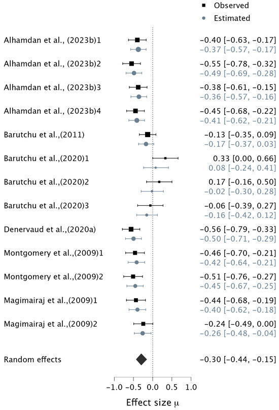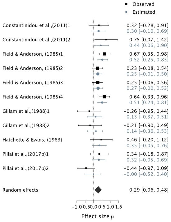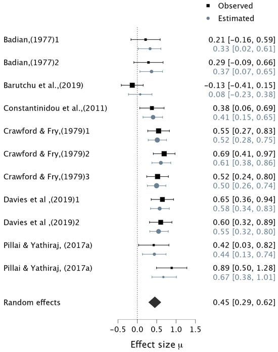 - Langan, D., Higgins, J. P. T., Jackson, D., Bowden, J., Veroniki, A. A., Kontopantelis, E., Viechtbauer, W., & Simmonds, M. (2019). A comparison of heterogeneity variance estimators in simulated random-effects meta-analyses. Research Synthesis Methods, 10(1), 83–98. [Google Scholar] [CrossRef] [PubMed]