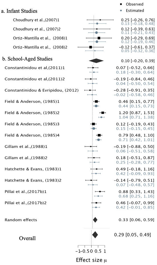 | 15 | (Ortiz-Mantilla et al., 2008) | To determine whether performance differences on language and cognitive tasks were due to poorer global cognitive performance or to deficits in specific processing abilities | Group differences | 32 | 8.97 mo (0.58) 6 & 9 mo | Auditory Visual Habituation Recognition Memory Task | 1. AVH/RM (6 mo) vs. VH/RM 0.20 [−0.29, 0.70] 2. AVH/RM (9 mo) vs. VH/RM −0.12 [−0.61, 0.37] | |